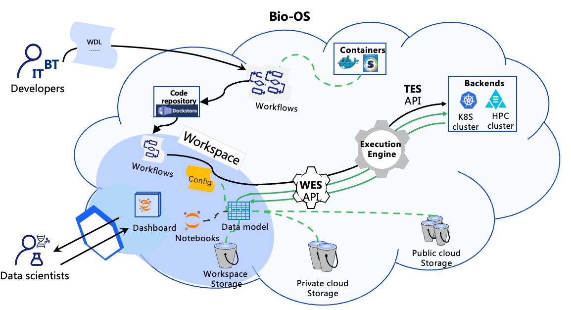 Bio-OS is an open-source platform for genomics users. It provides a workspace which encapsulates data, workflows, Notebooks, job history, etc. Bio-OS provides both GUI and CLI(Command Line Interface) to quickly setup and run workflows specified by languages like WDL and notebook as well.